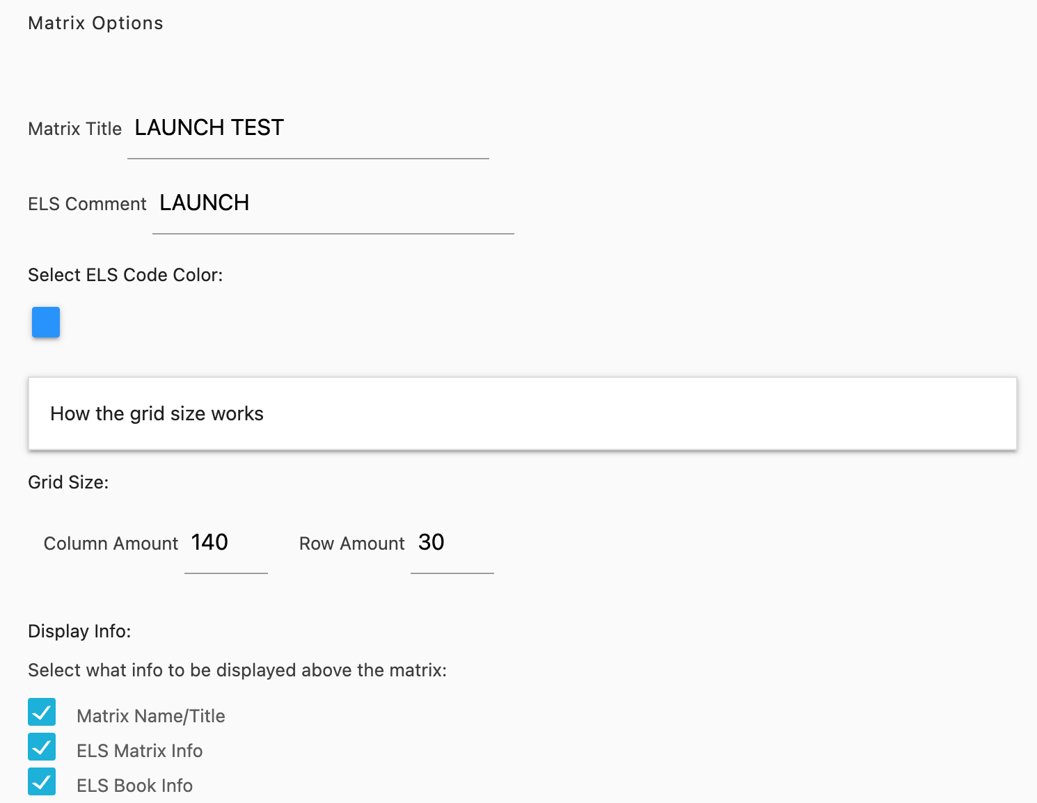 Specify the matrix title, ELS comment and code color, including row and column amounts and display info.